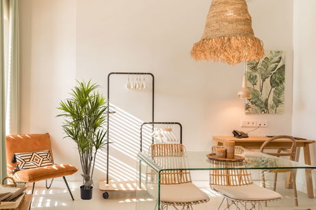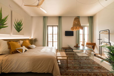 The studios have full equipment distributed in a functional kitchen, designer bathroom, open space with dining area, desk, wardrobe storage area, king size bed and large balcony windows with views of the Bay of Sant Antoni.